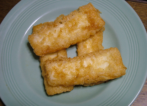 このチーズは、そのまま食べるとかなりしょっぱいて硬くあまり美味しく無かったので、とりあえず簡単に揚げてみました。