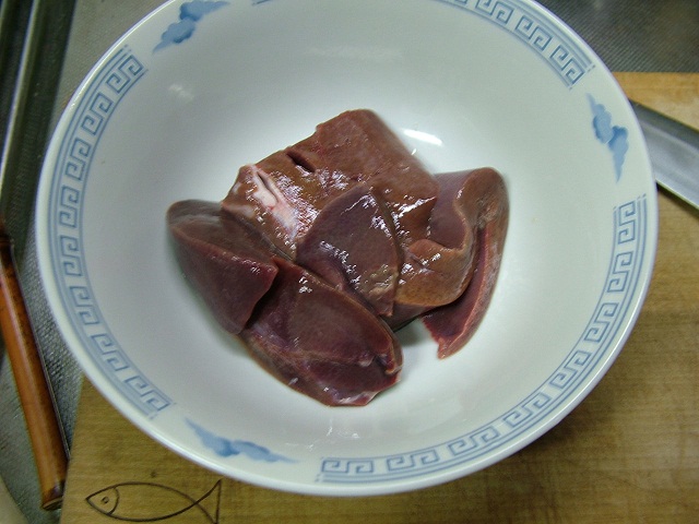 1、豚レバーを良く洗い、適当な大きさ(6等分ぐらい)に切り、水に浸けときます